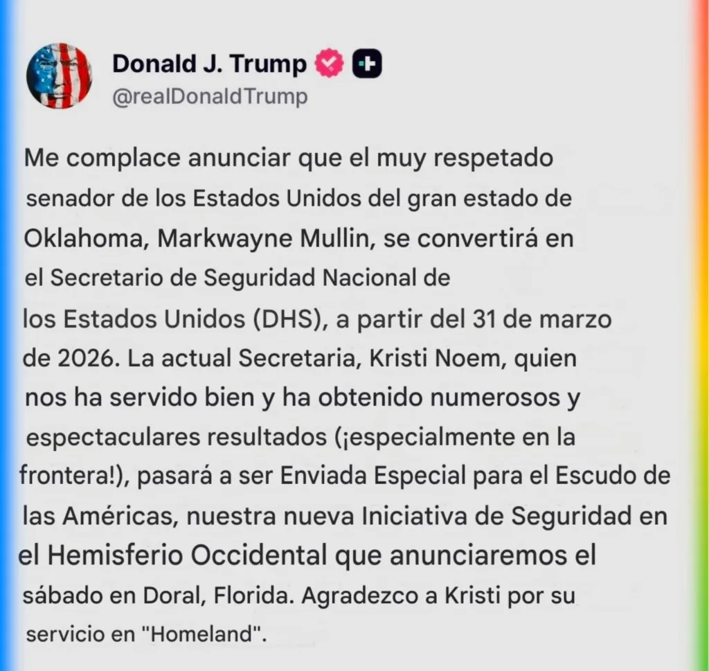 Durante un mensaje en su red Truth Social, Trump confirmó que Mullin será el nuevo secretario del Departamento de Seguridad Nacional (DHS). Además, indicó que Noem pasará a desempeñarse como enviada especial de una nueva iniciativa de seguridad regional.